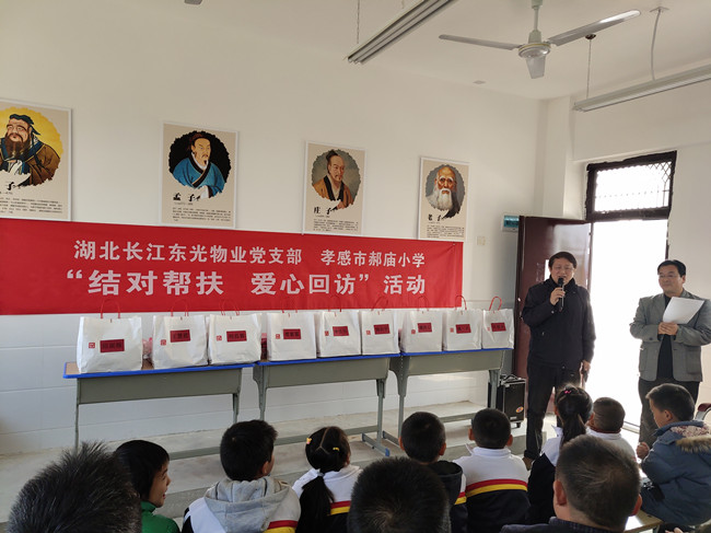 11月27日上午,長(zhǎng)江東光物業(yè)黨支部全體黨員在支部書記、總經(jīng)理倪良超帶領(lǐng)下,到公司黨建聯(lián)系點(diǎn)--孝感市新鋪鎮(zhèn)郝廟小學(xué)開展“結(jié)對(duì)幫扶 愛心回訪”活動(dòng)