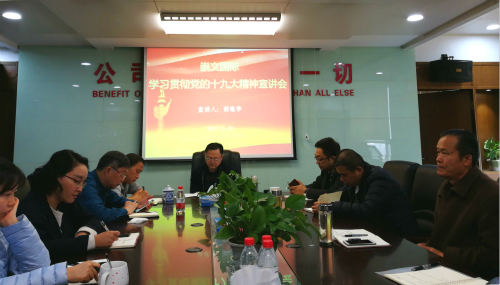 在11月28日組織全體員工聽取了集團(tuán)公司黨委委員、副總裁趙亞平精彩的十九大精神宣講課并獲得良好反響后,11月29日,崇文國(guó)際黨支部書記胡銀華也在全公司范圍內(nèi)對(duì)十九大精神進(jìn)行了宣講,在全公司上下掀起學(xué)習(xí)宣傳黨的十九大精神熱潮。
