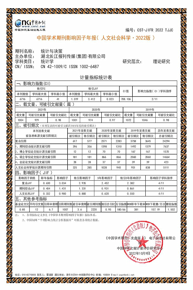近日,《中國學術(shù)期刊(光盤版)》電子雜志社有限公司與中國科學文獻計量評價研究中心聯(lián)合發(fā)布了《中國學術(shù)期刊影響因子年報》(2022年版),《統(tǒng)計與決策》期刊學術(shù)影響力指數(shù)(CI)在統(tǒng)計學科排名第二。