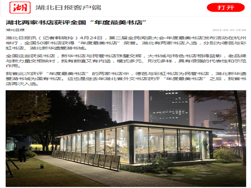 4月24日,第二屆全民閱讀大會?年度最美書店發(fā)布活動在杭州舉行,全國50家書店獲得“年度最美書店”榮譽。湖北有兩家書店入選,分別為德芭與彩虹書店、湖北新華遺愛湖書城。