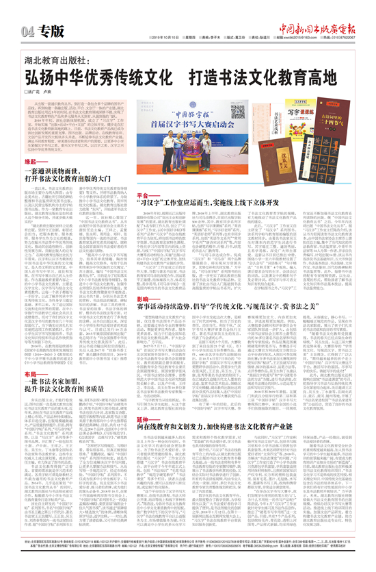 中國新聞出版廣電報(10月10日)第4版刊發(fā)專版報道——《湖北教育出版社:弘揚中華優(yōu)秀傳統(tǒng)文化?打造書法文化教育高地》。