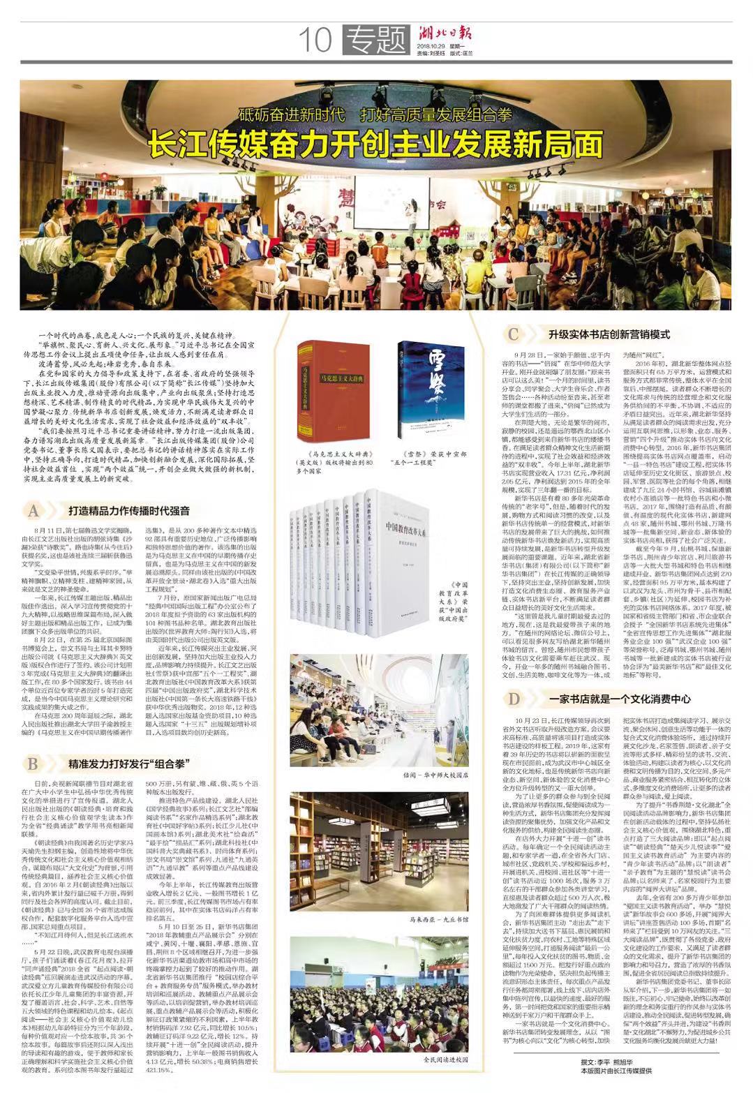 近年來,集團(股份)公司堅持穩(wěn)中求進的總基調(diào),突出主業(yè)發(fā)展、突出創(chuàng)新發(fā)展,強化黨建引領(lǐng)、強化基層基礎(chǔ)、強化規(guī)范管理、強化人才保障,各項工作取得了突出成果。10月29日,《中國新聞出版廣電報》和《湖北日報》分別以整版篇幅報道長江傳媒近兩年改革發(fā)展所取得的成就。