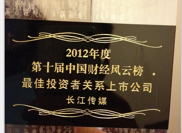 2012年12月6日,由和訊網(wǎng)主辦、和訊股票頻道承辦的“第十屆中國財經(jīng)風(fēng)云榜——證券市場高峰論壇暨證券行業(yè)頒獎典禮”在上海舉行。本次頒獎典禮上,長江出版?zhèn)髅焦煞萦邢薰精@得“2012年度第十屆中國財經(jīng)風(fēng)云榜最佳投資者關(guān)系上市公司”獎項。