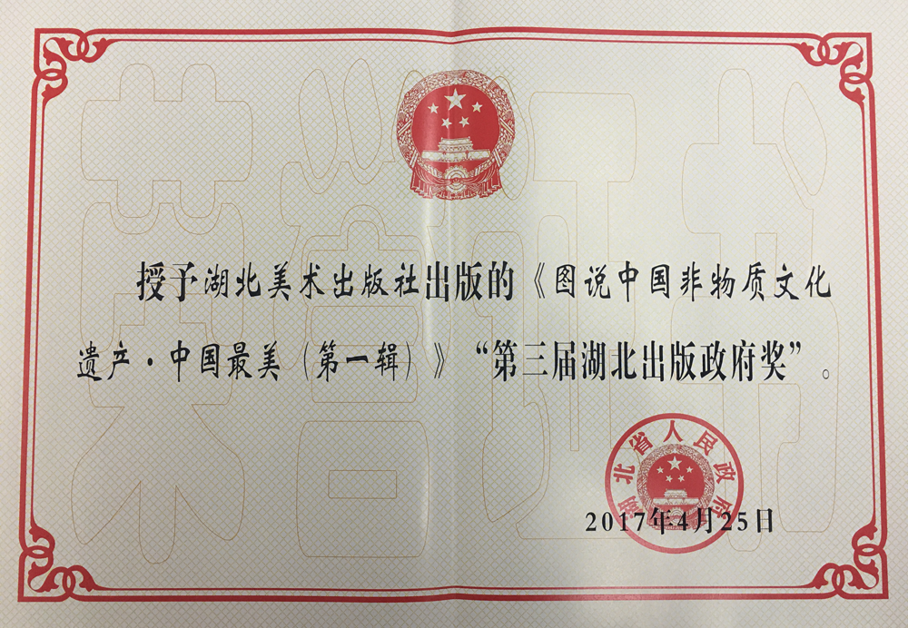 2017年9月7日,全省出版工作會(huì)議在東湖賓館梅嶺禮堂召開,會(huì)上進(jìn)行了第三屆湖北出版政府獎(jiǎng)表彰頒獎(jiǎng)。湖北美術(shù)出版社出版的《圖說中國非物質(zhì)文化遺產(chǎn)·中國最美(第一輯)》《湯文選全集》獲第三屆湖北出版政府獎(jiǎng)圖書獎(jiǎng);原湖北美術(shù)出版總編輯王開元獲第三屆湖北岀版政府獎(jiǎng)編輯獎(jiǎng)。