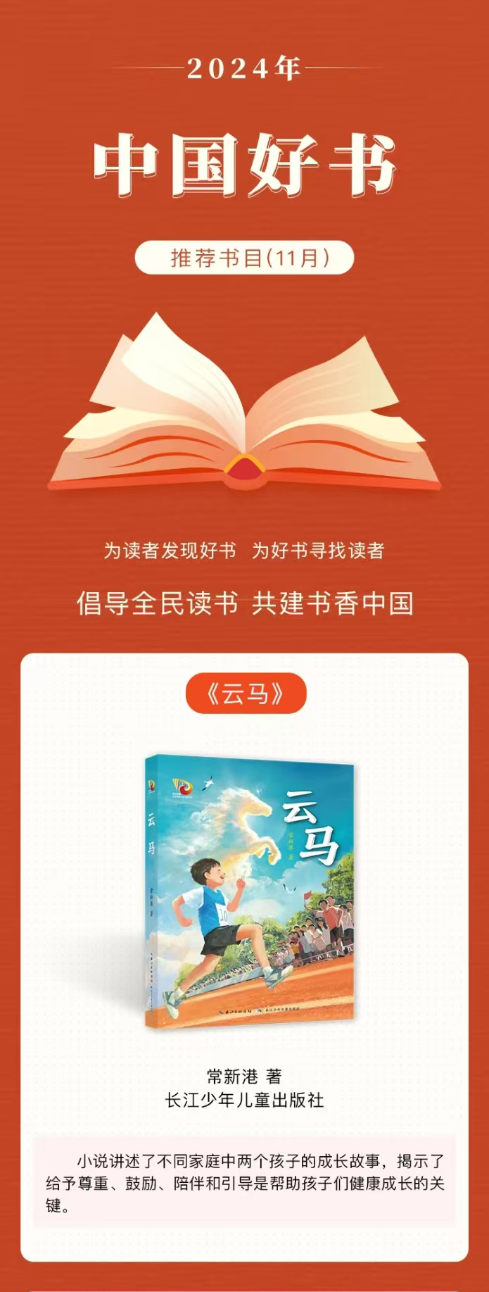 12月12日,中國(guó)圖書評(píng)論學(xué)會(huì)2024年11月“中國(guó)好書”推薦書目發(fā)布,長(zhǎng)江少年兒童出版社出版的長(zhǎng)篇兒童小說《云馬》(常新港著)入選。