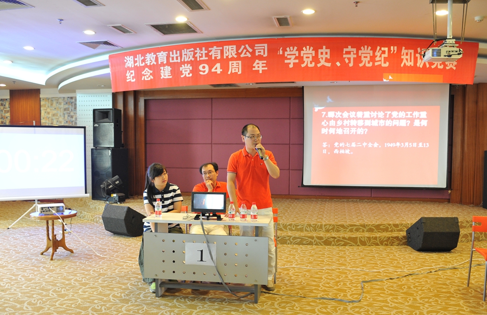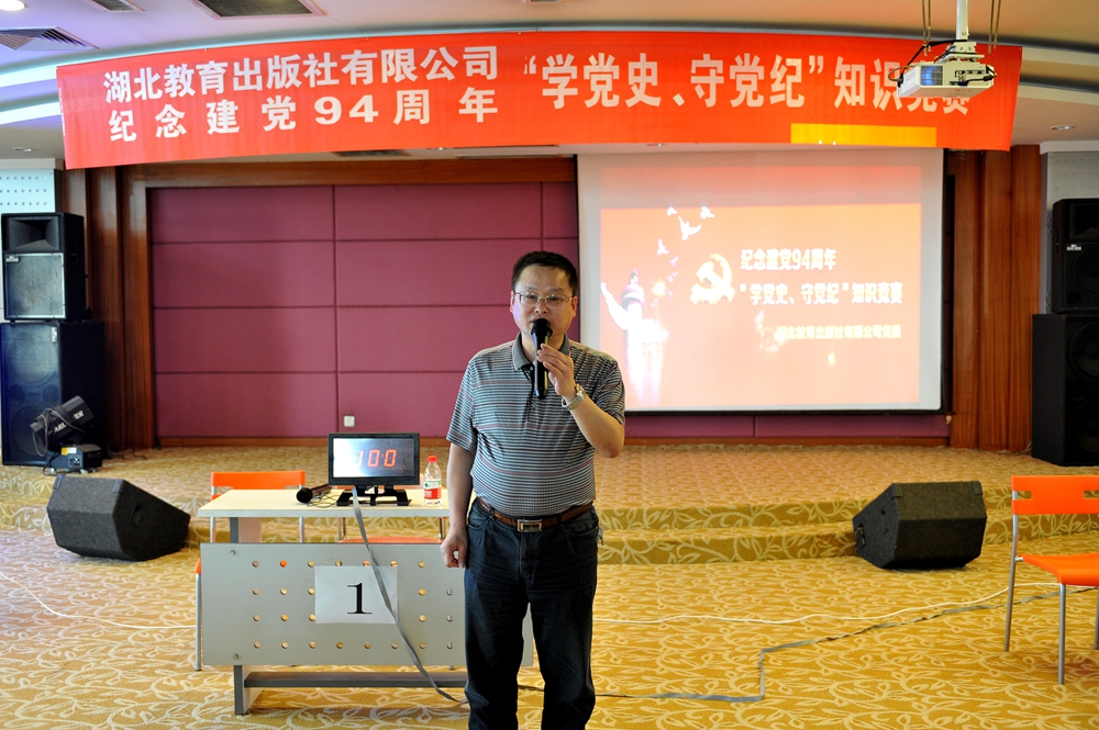 為慶祝中國共產黨建黨94周年,激勵廣大黨員學習黨的歷史、黨的知識、黨的理論和黨的革命傳統(tǒng),湖北教育出版社于6月24日舉辦了一場嚴肅活潑的“學黨史、守黨紀”知識競賽活動。教育社黨委委員、副總經理趙暉主持活動。全體在職黨員、老干黨支部黨員代表、入黨積極分子及共青團員觀看了比賽。