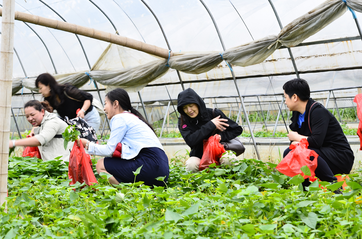 在蔬菜基地,大家在蔬菜大棚參觀綠色蔬菜,動手采摘,做了一次快樂的“農夫”,并充分了解了峒山社區(qū)居民生活。