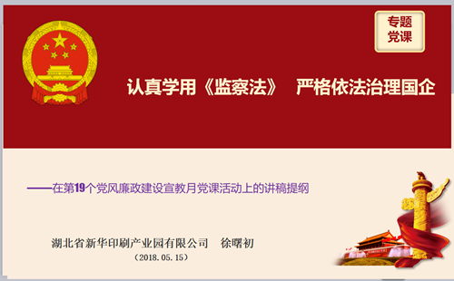 5月15日上午,湖北省新華印刷產(chǎn)業(yè)園有限公司開(kāi)展5月支部主題黨日活動(dòng),重點(diǎn)學(xué)習(xí)中共中央總書(shū)記、國(guó)家主席、中央軍委主席習(xí)近平在5月4日紀(jì)念馬克思誕辰200周年大會(huì)上發(fā)表的重要講話(huà)精神,公司黨委書(shū)記、總經(jīng)理徐曙初講專(zhuān)題黨課,引導(dǎo)大家集中學(xué)習(xí)和解讀《中華人民共和國(guó)監(jiān)察法》。