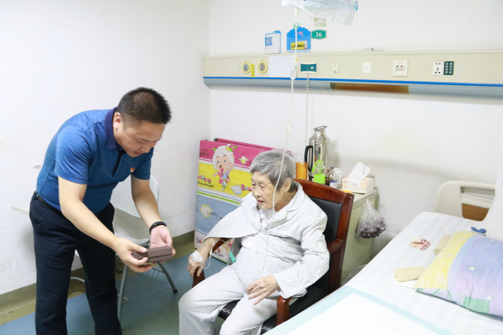 因年歲已高,身體機(jī)能有所下降,腿有些浮腫,黨群部李姬俯身細(xì)細(xì)問詢病情。肖董囑咐老人好好養(yǎng)病,保重身體;重陽節(jié)和余老的生日也將臨近,他同時(shí)向余老表示祝賀,送上慰問金,祝福老人家健康長壽。
