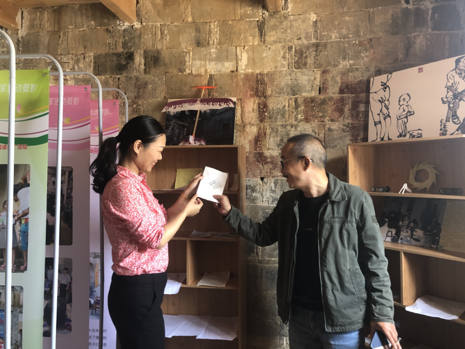 在集團(tuán)扶貧工作隊隊長嚴(yán)強(qiáng)華等人的陪同下,一行人來到“村讀——朱鋪鄉(xiāng)村閱讀文化空間”,現(xiàn)場參觀了朱鋪村中小學(xué)生、留守兒童的繪畫作品和手工作品,關(guān)心詢問了他們的生活和學(xué)習(xí)情況,并將價值萬余元的書架、手工作品展示架、畫夾網(wǎng)、畫架等基礎(chǔ)設(shè)施和58種、300余冊少兒類圖書,一并交由朱鋪村支部書記余云沼手中,幫助朱鋪村打造鄉(xiāng)村閱讀文化空間,助力村民豐富精神文化生活。