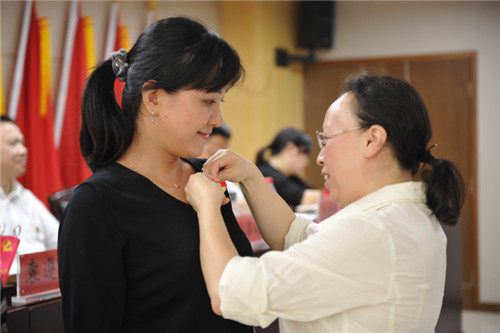 黨委委員黃燕為新黨員佩戴黨徽