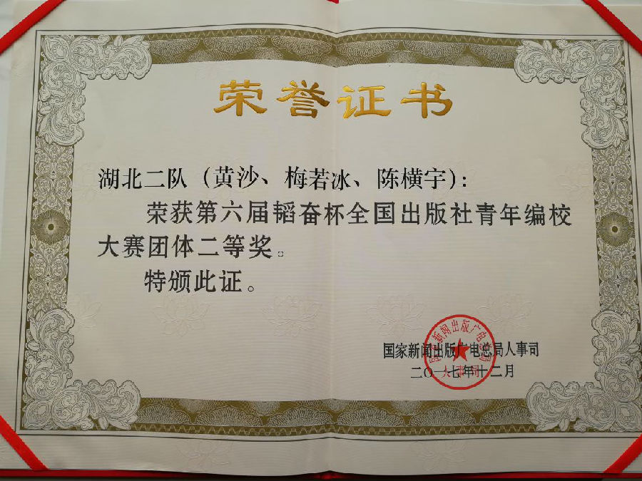 2017年12月2日,由國家新聞出版廣電總局主辦,中國出版協(xié)會、韜奮基金會、中國編輯學會承辦的第六屆韜奮杯全國出版社青年編校大賽圓滿閉幕,人民社青年編輯黃沙榮獲編輯個人二等獎;由人民社編輯黃沙、長江文藝出版社編輯梅若冰、湖北科技出版社校對陳橫宇組成的湖北二隊榮獲團體二等獎(省屬單位最高獎項)。這一可喜成績令人民社深感自豪,人心振奮。