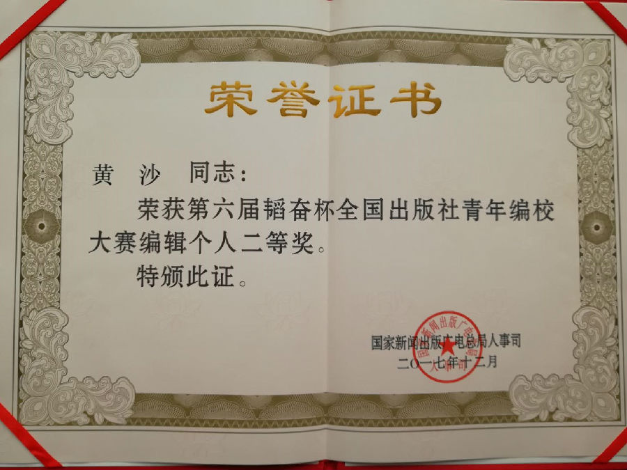 人民社編輯黃沙在第六屆韜奮杯全國出版社青年編校大賽中喜獲佳績