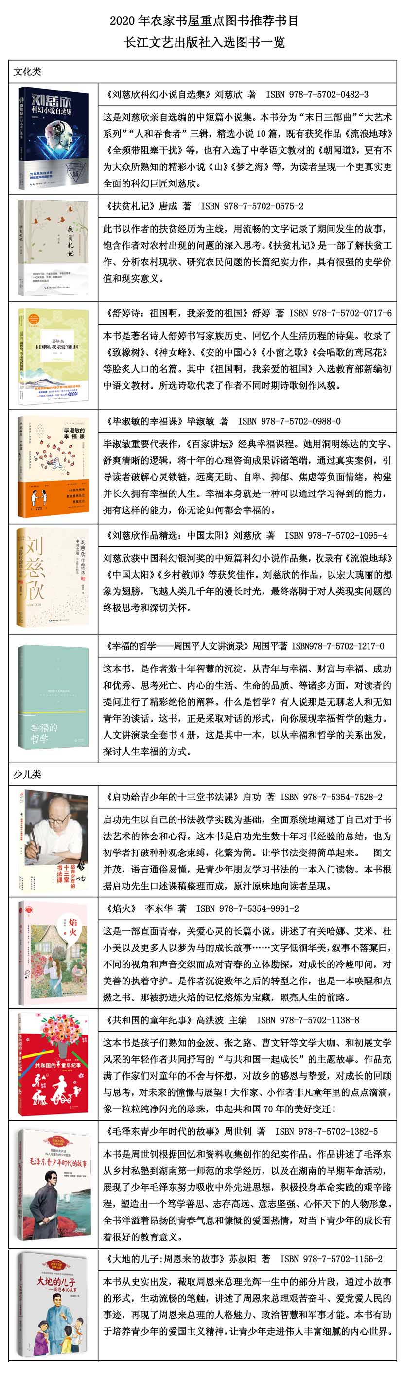 近日,國(guó)家新聞出版署印發(fā)《2020年農(nóng)家書(shū)屋重點(diǎn)出版物推薦目錄》,共推薦重點(diǎn)圖書(shū)1781種、報(bào)紙31種、期刊155種、音像制品和電子出版物113種、少數(shù)民族文字圖書(shū)310種。長(zhǎng)江文藝出版社共有11種圖書(shū)入選,其中6種為文化類(lèi)重點(diǎn)圖書(shū),5種為少兒類(lèi)重點(diǎn)圖書(shū),少兒類(lèi)圖書(shū)入選數(shù)量創(chuàng)歷史新高。