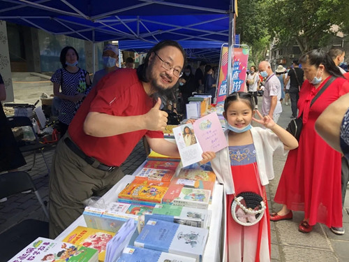 長(zhǎng)少社的首場(chǎng)“練攤”恰逢端午節(jié)當(dāng)天,特別邀請(qǐng)到著名作家“大胡子叔叔”董宏猷,為我社精品圖書(shū)現(xiàn)場(chǎng)帶貨。董老師的到來(lái),帶動(dòng)了全場(chǎng)氣氛,引得讀者紛紛在我社攤位前駐足,挑選心儀的圖書(shū)。