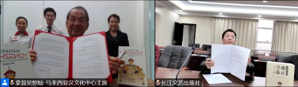 活動(dòng)最后,尹志勇與拿督吳恒燦在線上簽署了《雍正皇帝》第二與第三卷的合同并合影留念。雙方均表示藉此書推介活動(dòng)的成功舉辦,本著互惠互利、共同努力的精神,進(jìn)一步加深中馬兩國的友誼。