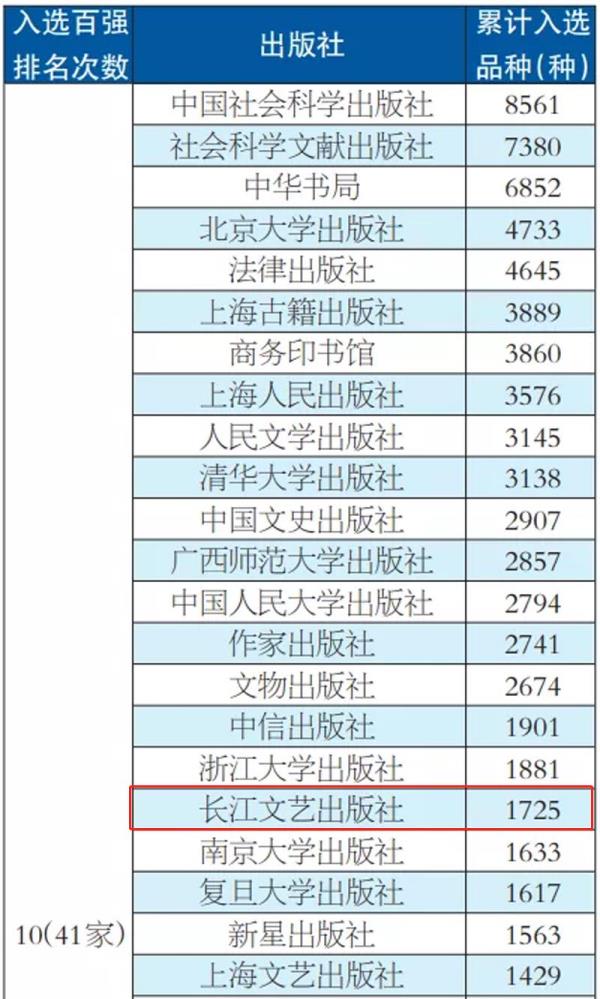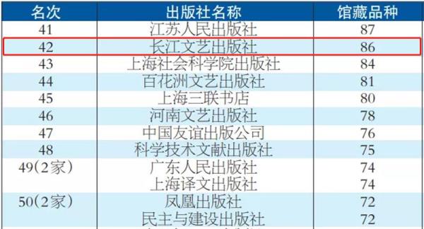 (通訊員 韓澍東)近日《2021年中國圖書海外館藏影響力報告》由中國出版?zhèn)髅缴虉螵毤野l(fā)布,2021年度共有467家出版社的17300種中文圖書進入海外圖書館系統永久收藏,長江文藝出版社連續(xù)十年躋身100強,累計入選品種1725種,2021年以86個品種位列第42名。