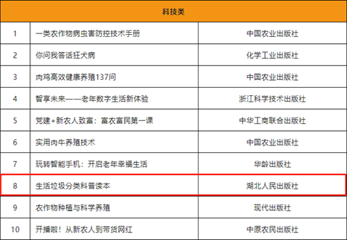 湖北人民出版社圖書《生活垃圾分類科普讀本》入選,這是該書繼入選“荊楚十佳圖書提名獎”“全國農(nóng)家書屋重點出版物推薦目錄”后獲得的又一殊榮。