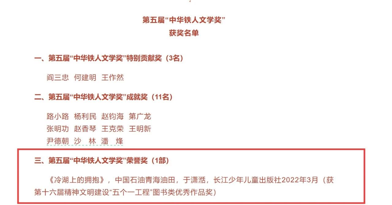 《冷湖上的擁抱》獲第五屆“中華鐵人文學(xué)獎”榮譽獎