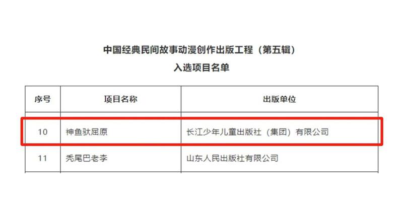 中國經(jīng)典民間故事動(dòng)漫創(chuàng)作出版工程(第五輯)入選項(xiàng)目揭曉,長江少年兒童出版社出版的《神魚馱屈原》入選。
