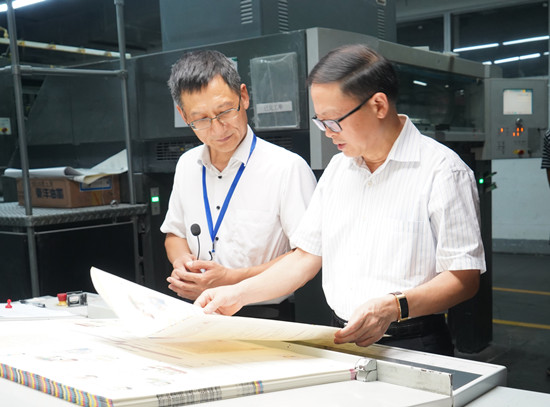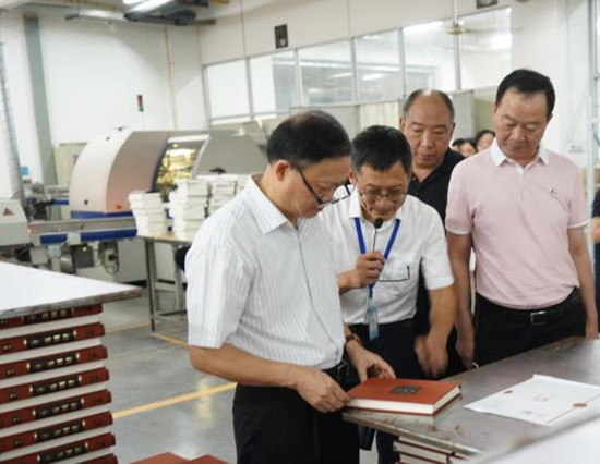 到達(dá)公司后,陳樹林副部長深入車間生產(chǎn)一線,先后到平版彩印車間、裝訂車間了解各工序教材印裝情況,對中小學(xué)教科書印制從紙張、印刷、裝訂、設(shè)備、產(chǎn)能、品控等環(huán)節(jié)做了詳細(xì)詢問,最后到精品圖書生產(chǎn)車間查看了《荊楚文庫》印制。