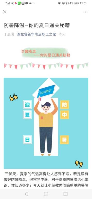 集團黨委和工會歷來高度重視員工關(guān)懷,今年工會還用微信編輯了淺顯易懂的文案“防暑降溫——您的夏日通關(guān)秘籍”,方便大家轉(zhuǎn)發(fā)普及防暑降溫小常識,保障高溫天氣下員工的身心健康,令員工倍感關(guān)懷。