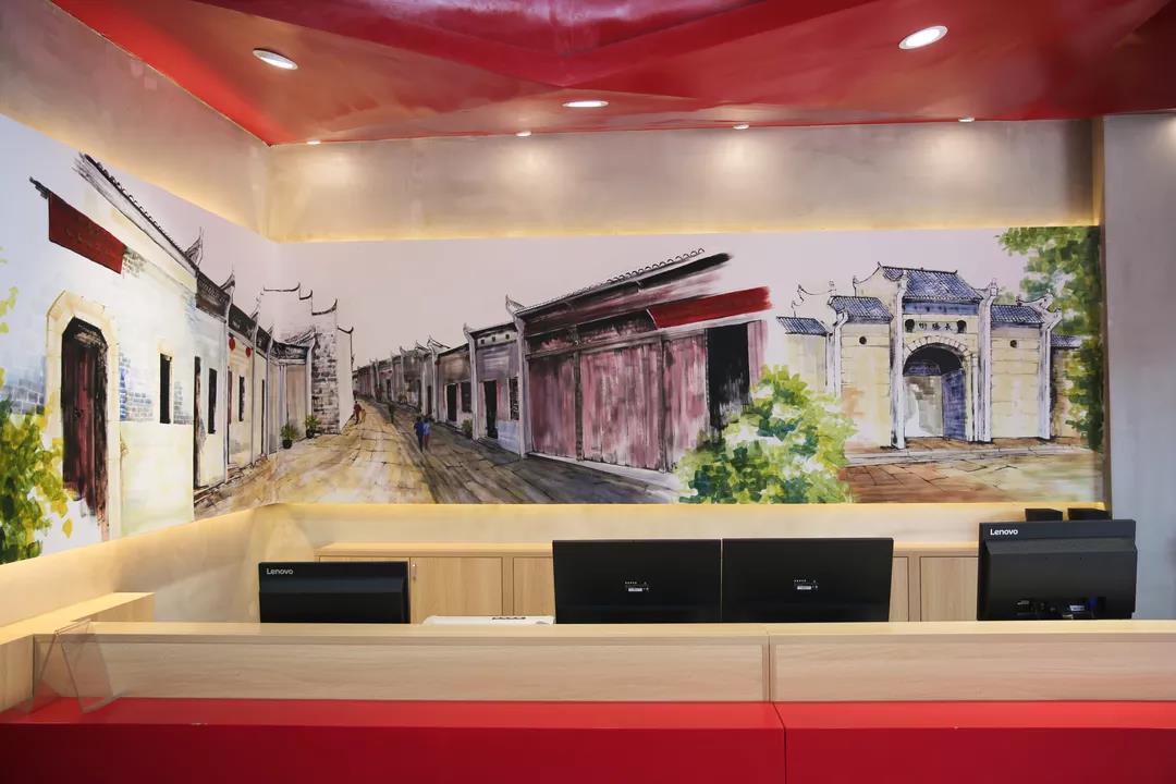 書店內(nèi)紅色元素隨處可見:“小小黃安,人人好漢;男將打仗,女將送飯?!?這首每個紅安人耳熟能詳?shù)摹饵S安謠》呈現(xiàn)于書店進(jìn)門最顯眼的左側(cè)墻上,配上黃麻起義的素描場景,瞬間將讀者拉回到革命年代;右側(cè)墻體上則是七里坪長勝街的街景,講述著紅安革命隊伍不斷壯大、數(shù)十年紅旗不倒的光輝歷史。