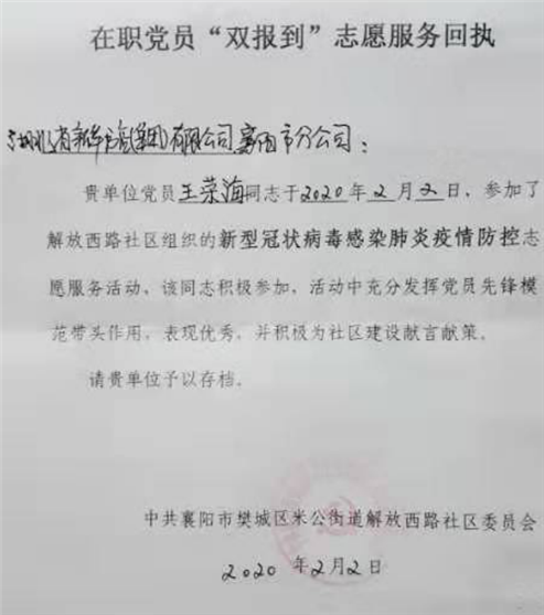 襄陽市分公司黨員到社區(qū)報到參與志愿服務(wù)