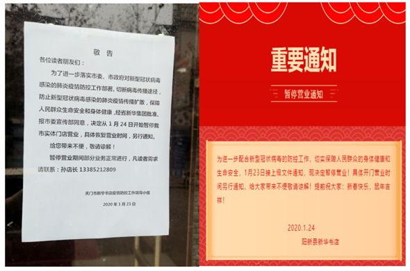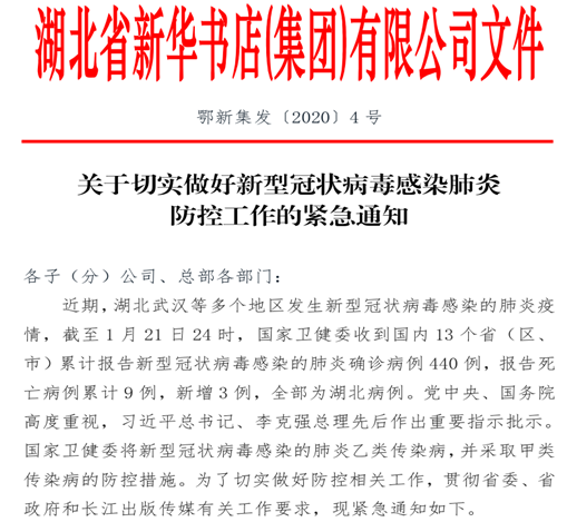 隨著疫情形勢的進(jìn)一步嚴(yán)峻,湖北新華1月23日連夜下發(fā)了《關(guān)于暫停全省實(shí)體門店營業(yè)的緊急通知》,從1月24日開始,全省所有實(shí)體門店暫停營業(yè),以切斷病毒傳播途徑,防止疫情傳播擴(kuò)散,保障員工和讀者群眾生命安全。
