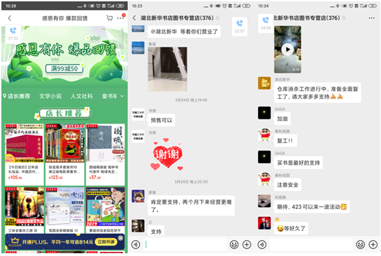 對(duì)新華書(shū)店集團(tuán)來(lái)說(shuō),線(xiàn)上“社群營(yíng)銷(xiāo)”是新生事物,沒(méi)有現(xiàn)成經(jīng)驗(yàn)可資借鑒,只能在實(shí)踐中摸索、邊學(xué)邊干。集團(tuán)上下聯(lián)動(dòng),一方面,總部業(yè)務(wù)部門(mén)積極尋找和整合資源,總結(jié)和推廣經(jīng)驗(yàn),策劃營(yíng)銷(xiāo)活動(dòng)為線(xiàn)下門(mén)店提供服務(wù)和指導(dǎo);另一方面,線(xiàn)下門(mén)店積極通過(guò)微信公眾號(hào)、微信群、QQ群等方式開(kāi)展社群營(yíng)銷(xiāo),大力在線(xiàn)開(kāi)展話(huà)題互動(dòng)、閱讀打卡、線(xiàn)上“慧閱讀”分享、圖書(shū)推薦等活動(dòng),為客戶(hù)提供在線(xiàn)預(yù)訂和線(xiàn)下無(wú)接觸配送服務(wù)。各門(mén)店還通過(guò)直播帶領(lǐng)讀者“云逛書(shū)店”,宣傳介紹門(mén)店新空間和多業(yè)態(tài)產(chǎn)品服務(wù);通過(guò)開(kāi)微店為客戶(hù)提供購(gòu)書(shū)便利;通過(guò)與美團(tuán)平臺(tái)合作,擴(kuò)大平臺(tái)流量入口,將圖書(shū)、多元產(chǎn)品從門(mén)店拓寬到線(xiàn)上平臺(tái)。