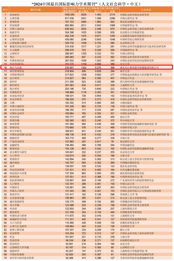12月24日,由中國知網(wǎng)、清華大學(xué)圖書館聯(lián)合研制的《中國學(xué)術(shù)期刊國際引證年報》(2024版)正式發(fā)布,湖北長江傳媒統(tǒng)計與決策學(xué)術(shù)傳播有限公司《統(tǒng)計與決策》榮膺“2024中國最具國際影響力學(xué)術(shù)期刊”,位列人文社科中文期刊第16位,居統(tǒng)計學(xué)期刊第1位。