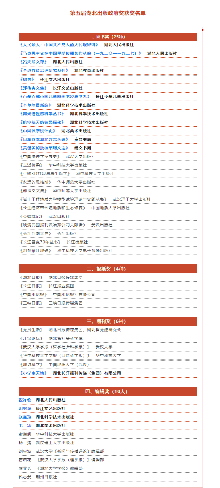近日,湖北省人民政府發(fā)布關(guān)于頒發(fā)第五屆湖北出版政府獎(jiǎng)的通報(bào),授予25種圖書、4種報(bào)紙、6種期刊和10名同志“第五屆湖北出版政府獎(jiǎng)”。長(zhǎng)江傳媒14種出版物獲獎(jiǎng),4人獲評(píng)“編輯獎(jiǎng)”。