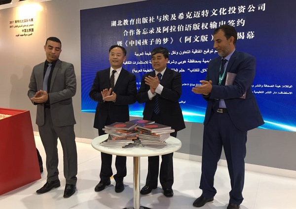 4月26日,在第27屆阿布扎比國際書展上,湖北教育出版社與埃及??诉~特文化投資公司簽署成立“長江傳媒中埃編輯部”合作備忘錄及阿拉伯語版權(quán)輸出協(xié)議,并舉行了《中國孩子的夢》阿文版首發(fā)揭幕。國家新聞出版廣電總局副局長吳尚之、中央宣傳部出版局副局長張擁軍、埃及出版商協(xié)會負責(zé)人米索利、國家新聞出版廣電總局報刊司司長李軍和進口管理司司長蔣茂凝、湖北省新聞出版廣電局副局長鄢桃生出席了活動。