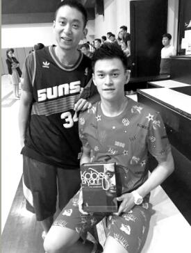 中國(guó)奧運(yùn)冠軍孫楊(右)與《科比·布萊恩特全傳》作者段冉(左)合影。 湖北科技社 供圖