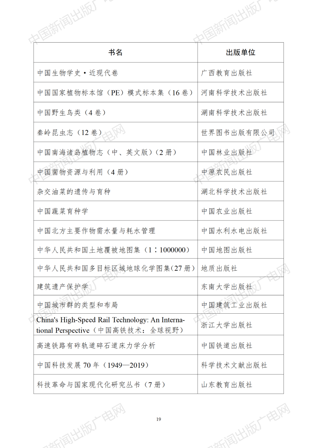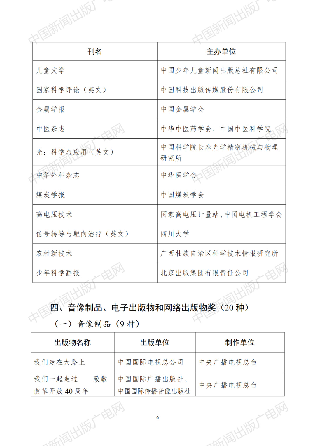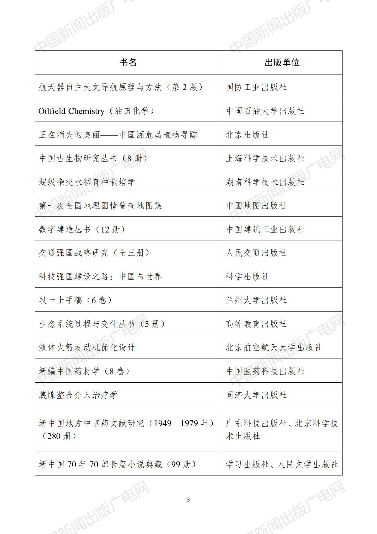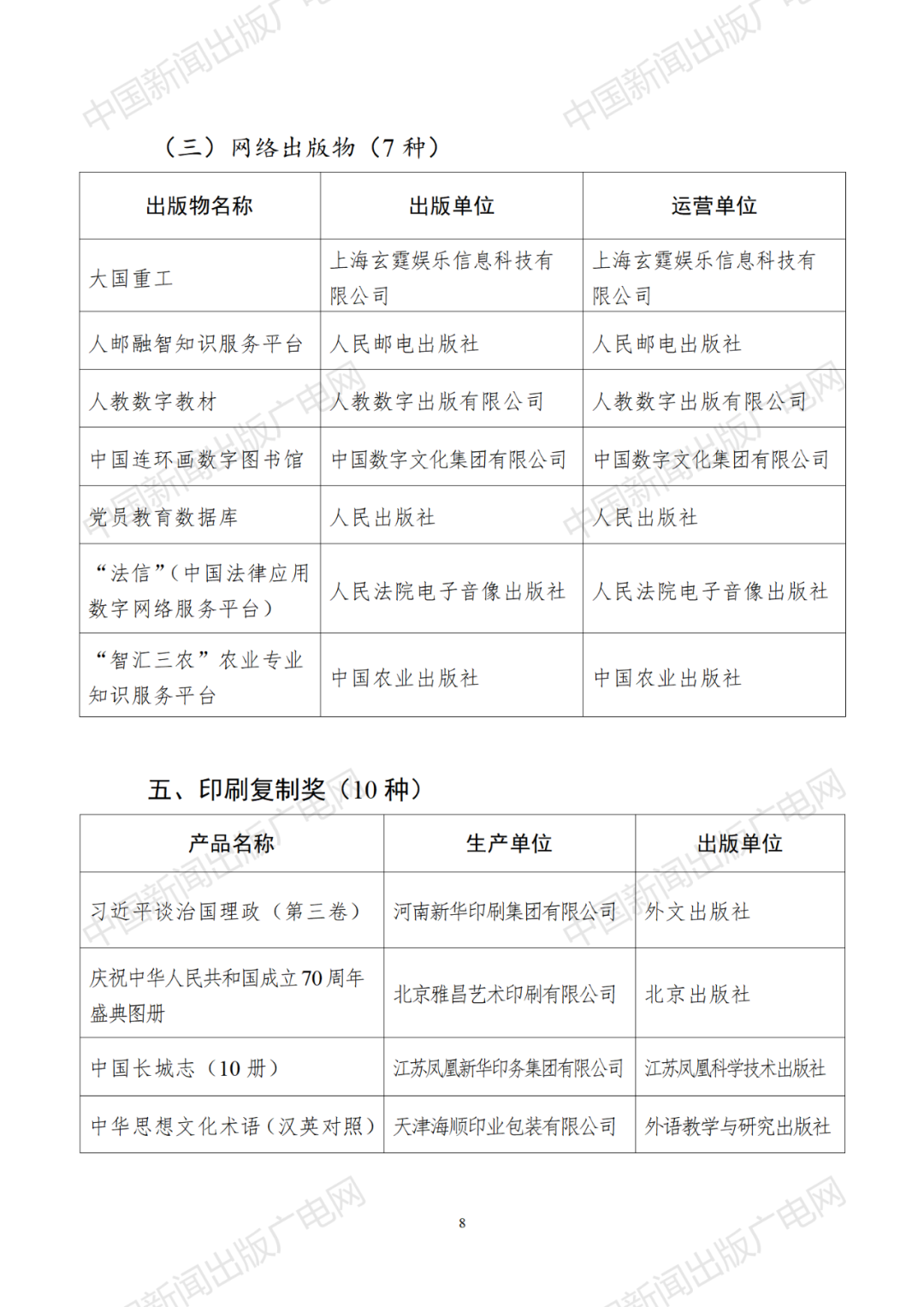 為深入學(xué)習(xí)宣傳貫徹習(xí)近平新時(shí)代中國(guó)特色社會(huì)主義思想,全面落實(shí)黨的十九大和十九屆二中、三中、四中、五中全會(huì)精神,促進(jìn)出版業(yè)高質(zhì)量發(fā)展,推進(jìn)社會(huì)主義文化強(qiáng)國(guó)建設(shè),根據(jù)《中國(guó)出版政府獎(jiǎng)評(píng)獎(jiǎng)?wù)鲁獭芬?guī)定,國(guó)家新聞出版署組織開(kāi)展第五屆中國(guó)出版政府獎(jiǎng)評(píng)選表彰活動(dòng)。經(jīng)嚴(yán)格評(píng)選,《習(xí)近平談治國(guó)理政》(第一、二、三卷)等3種圖書(shū)獲榮譽(yù)獎(jiǎng),《習(xí)近平新時(shí)代中國(guó)特色社會(huì)主義思想學(xué)習(xí)綱要》等60種圖書(shū)獲圖書(shū)獎(jiǎng),《中共黨史研究》等20種期刊獲期刊獎(jiǎng),《我們走在大路上》等20種作品獲音像制品、電子出版物和網(wǎng)絡(luò)出版物獎(jiǎng),《慶祝中華人民共和國(guó)成立70周年盛典圖冊(cè)》等10種作品獲印刷復(fù)制獎(jiǎng),《嘉卉——百年中國(guó)植物科學(xué)畫(huà)》等10種作品獲裝幀設(shè)計(jì)獎(jiǎng);人民出版社等50家單位獲先進(jìn)出版單位獎(jiǎng);高克勤等69名個(gè)人獲優(yōu)秀出版人物獎(jiǎng)。此外,237種優(yōu)秀出版物獲提名獎(jiǎng)。