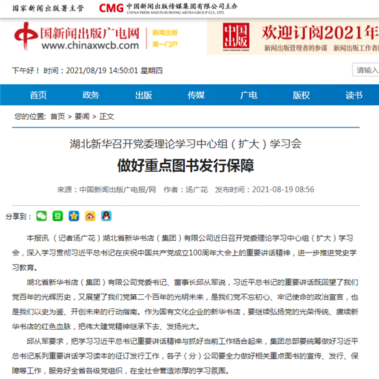 中國新聞出版廣電網(wǎng) | 湖北新華召開黨委理論學習中心組(擴大)學習會 做好重點圖書發(fā)行保障