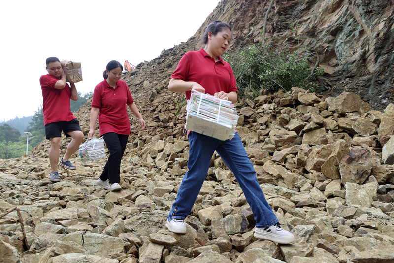 ▲ 8月25日,湖北新華十堰市分公司教育服務團隊茅箭片區(qū)組長方芳(右一)和同事們跨越滑坡路段,為茅塔鄉(xiāng)大坪村大坪小學的師生們送去教材。