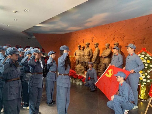 在新四軍第五師歷史陳列館入口的大型浮雕群英圖前,換好紅軍服的黨員同志面向黨旗,舉起右拳,重溫入黨誓詞。宣誓儀式結(jié)束后,大家合唱了經(jīng)典紅色曲目《沒有共產(chǎn)黨就沒有新中國》。